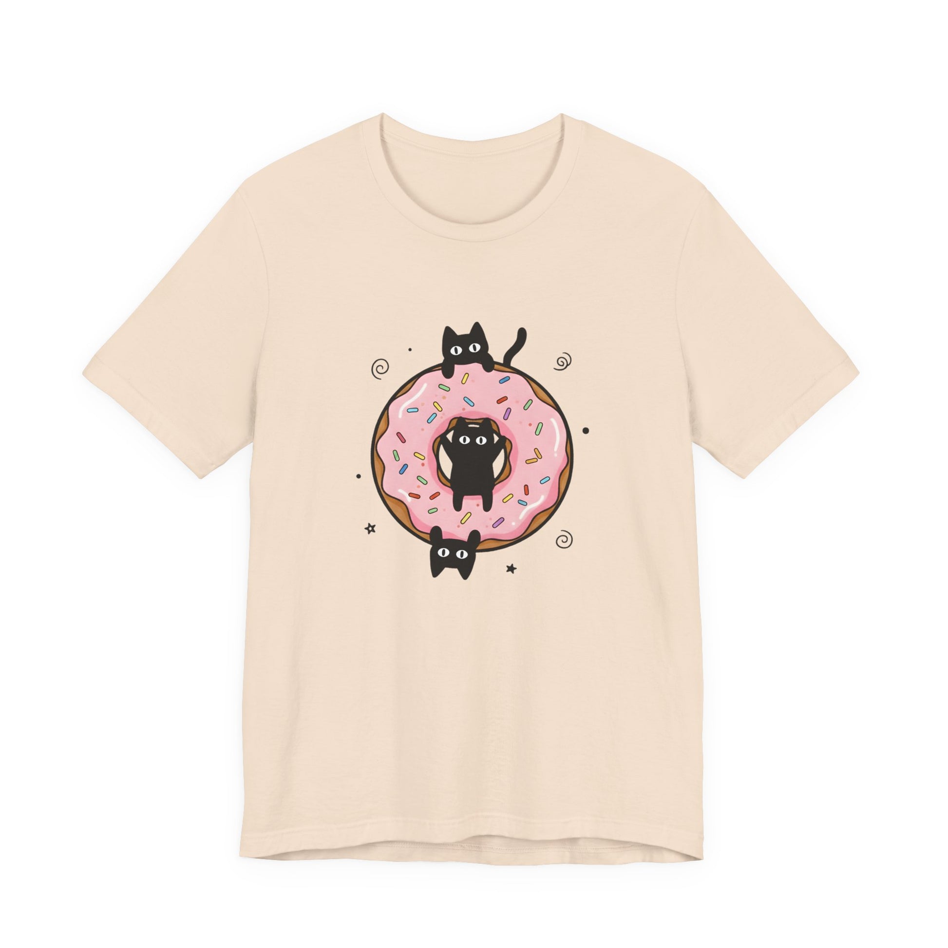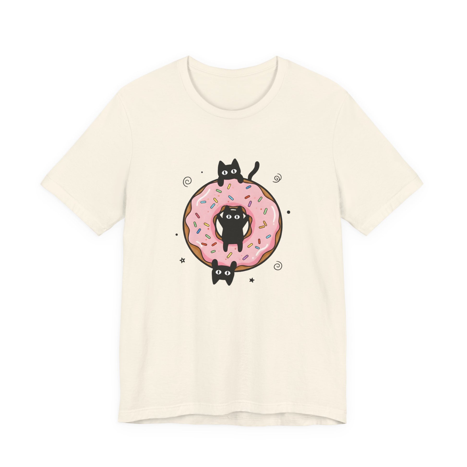 Whether you're treating yourself to a donut at your local bakery or cuddling with your cat on the couch, this t-shirt celebrates life's simple joys. The playful design and neutral background make it easy to pair with jeans, shorts, or leggings while showcasing your passion for both felines and frosted treats.