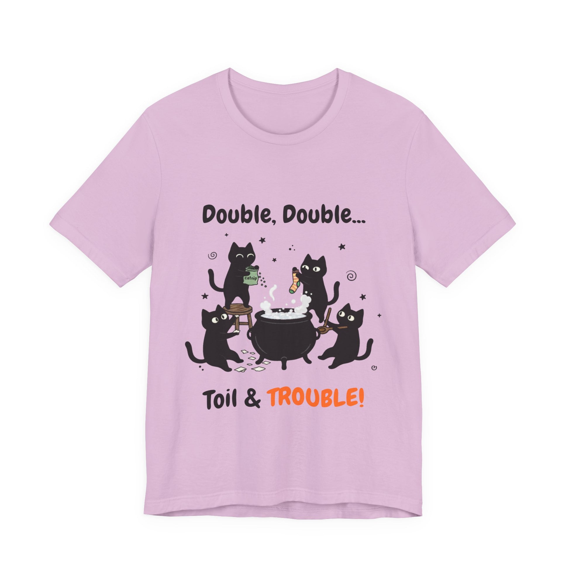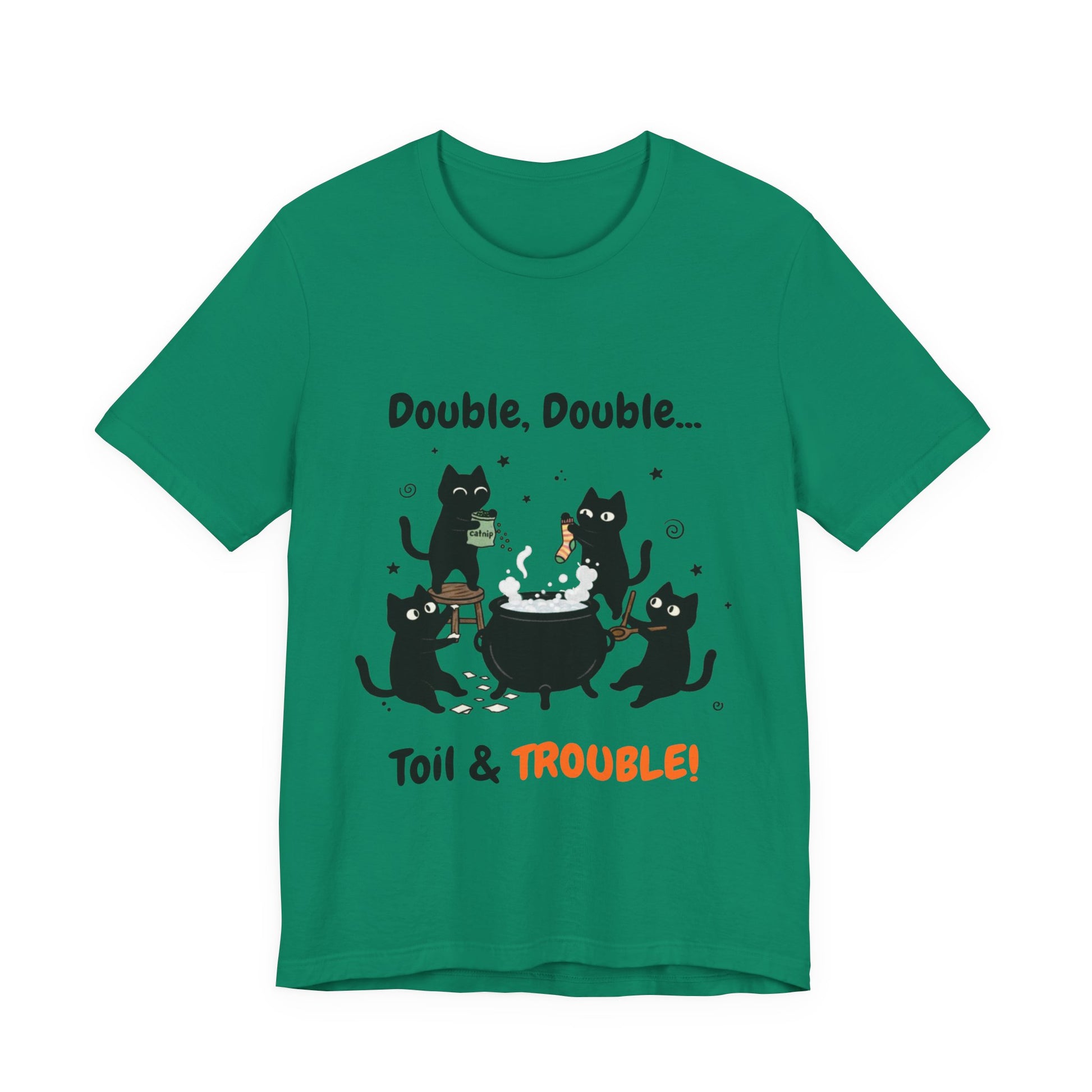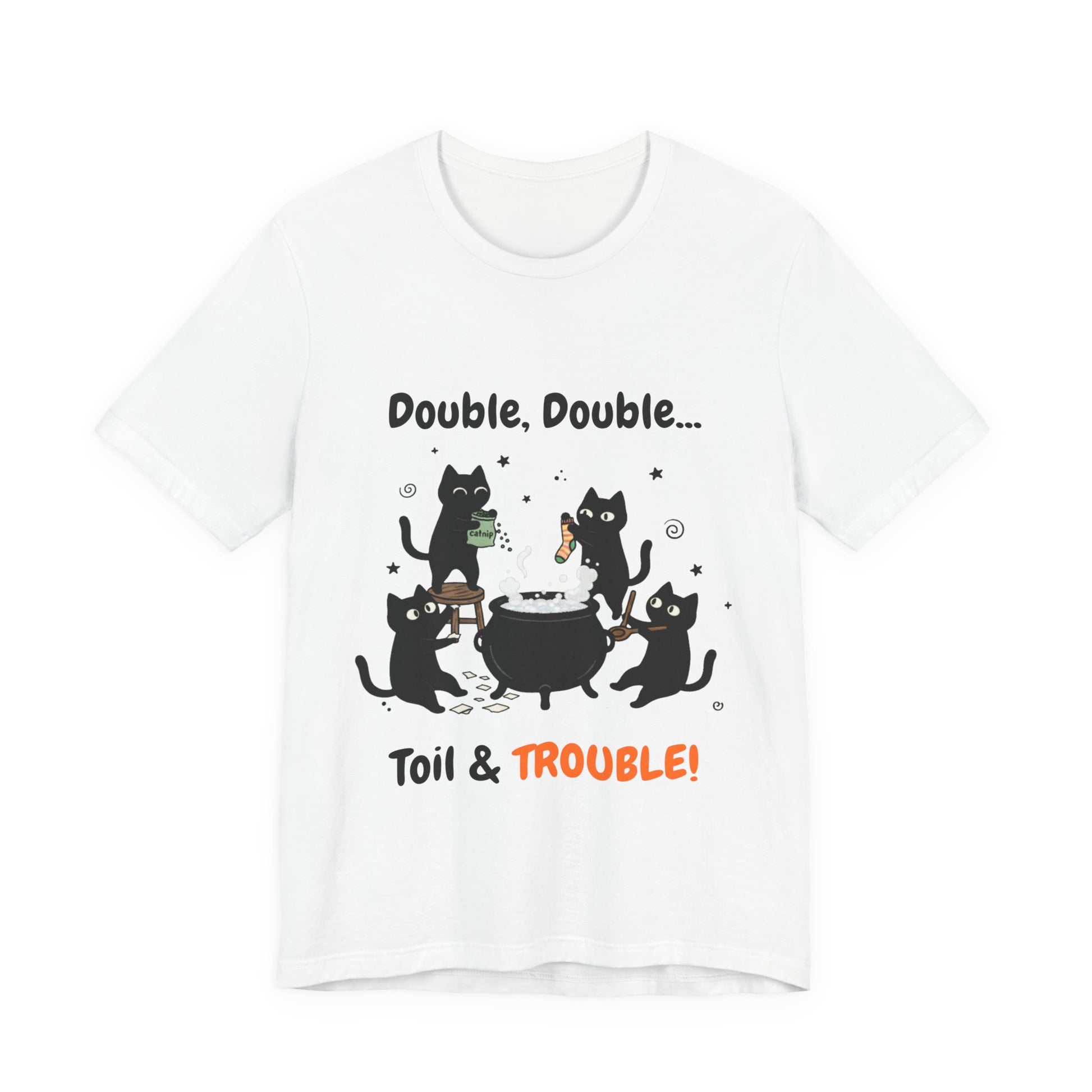 Whether you're a kitchen witch brewing your morning coffee or simply someone who believes black cats bring good luck, this tee captures the playful magic of feline familiars. The clever Shakespeare-inspired text "Double, Double... Toil & TROUBLE!" adds a literary touch to this delightfully spooky design.